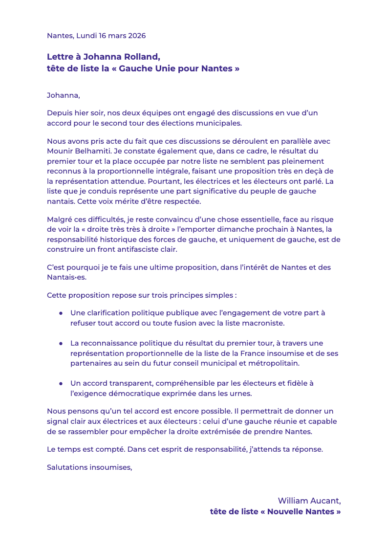 Quelques heures avant que la Gauche Unie pour Nantes n’annonce la fusion des listes de gauche en vue du second tour du 22 mars, William Aucant, tête de liste de « Nouvelle Nantes », prenait soin de rendre publiques ses conditions. Dans une lettre adressée directement à Johanna Rolland, datée du lundi 16 mars, le candidat insoumis exposait les termes d’un accord qu’il estimait encore « possible » — tout en laissant transparaître les tensions qui agitaient les négociations.