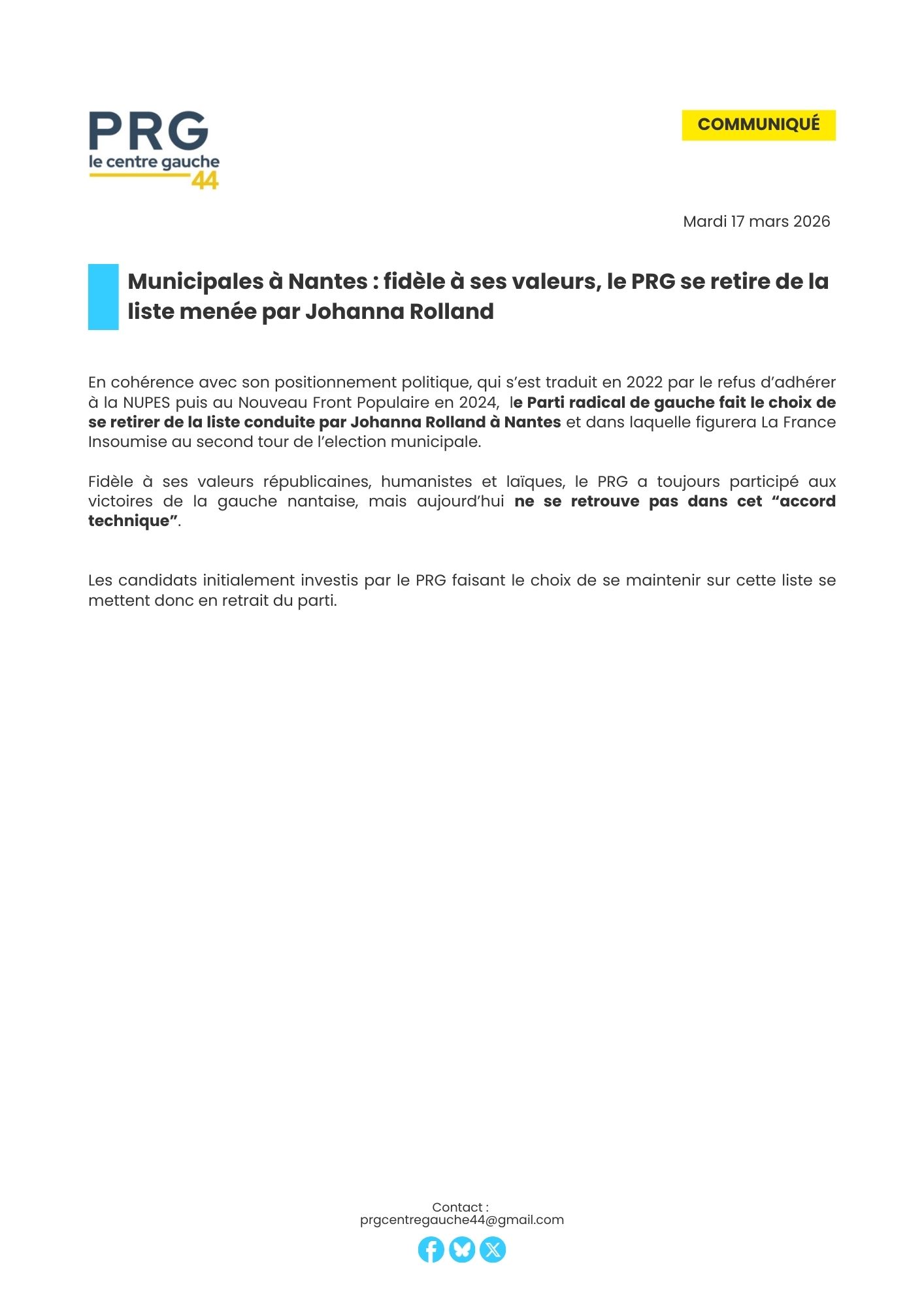 Ce que révèle cet épisode dépasse le seul cas du PRG. C’est toute la gauche nantaise qui aborde ce second tour en ordre partiellement dispersé : Bassem Asseh écarté, le PRG en rupture officielle, Salaün en fronde personnelle assumée. Johanna Rolland avance, mais dans un camp qui grince de toutes parts.